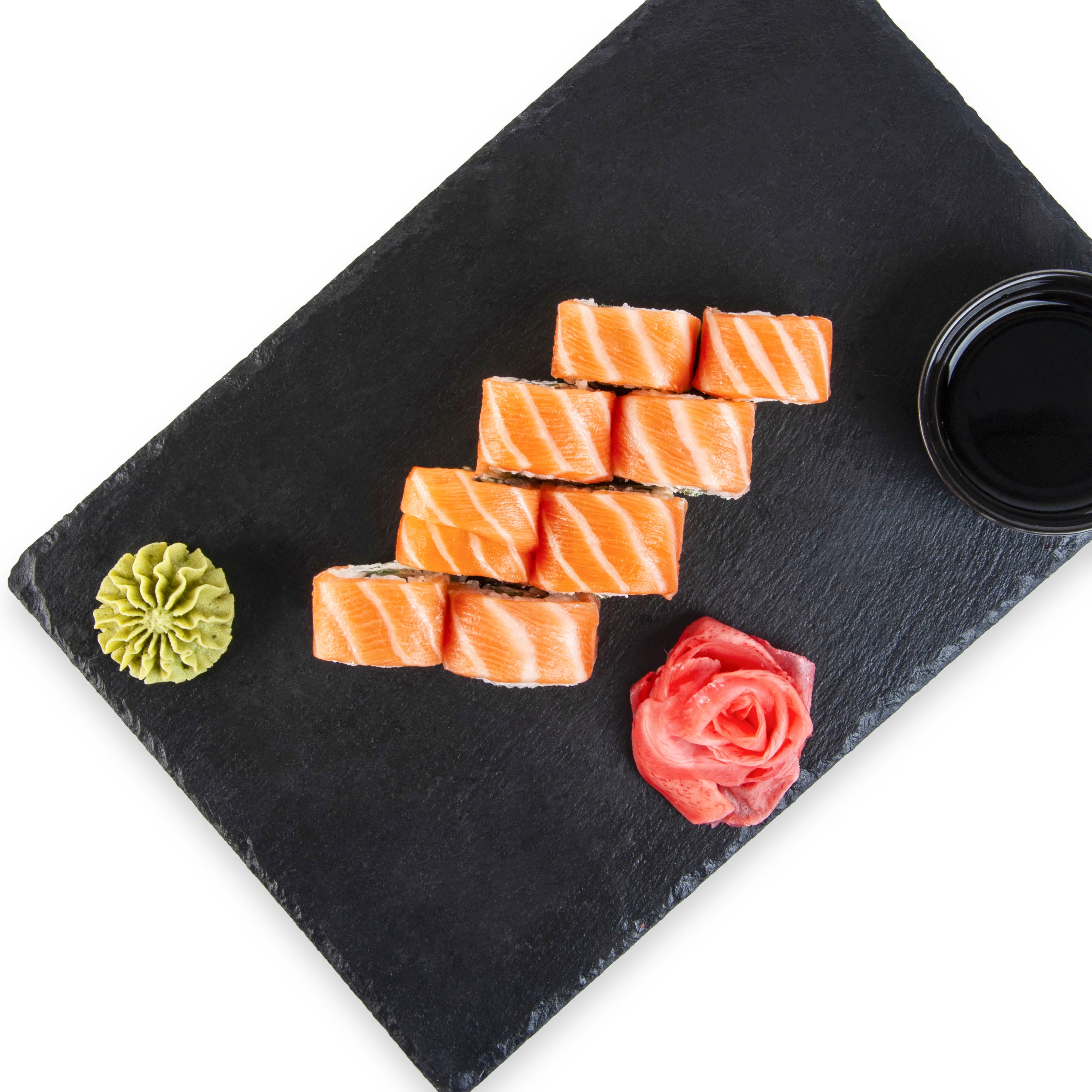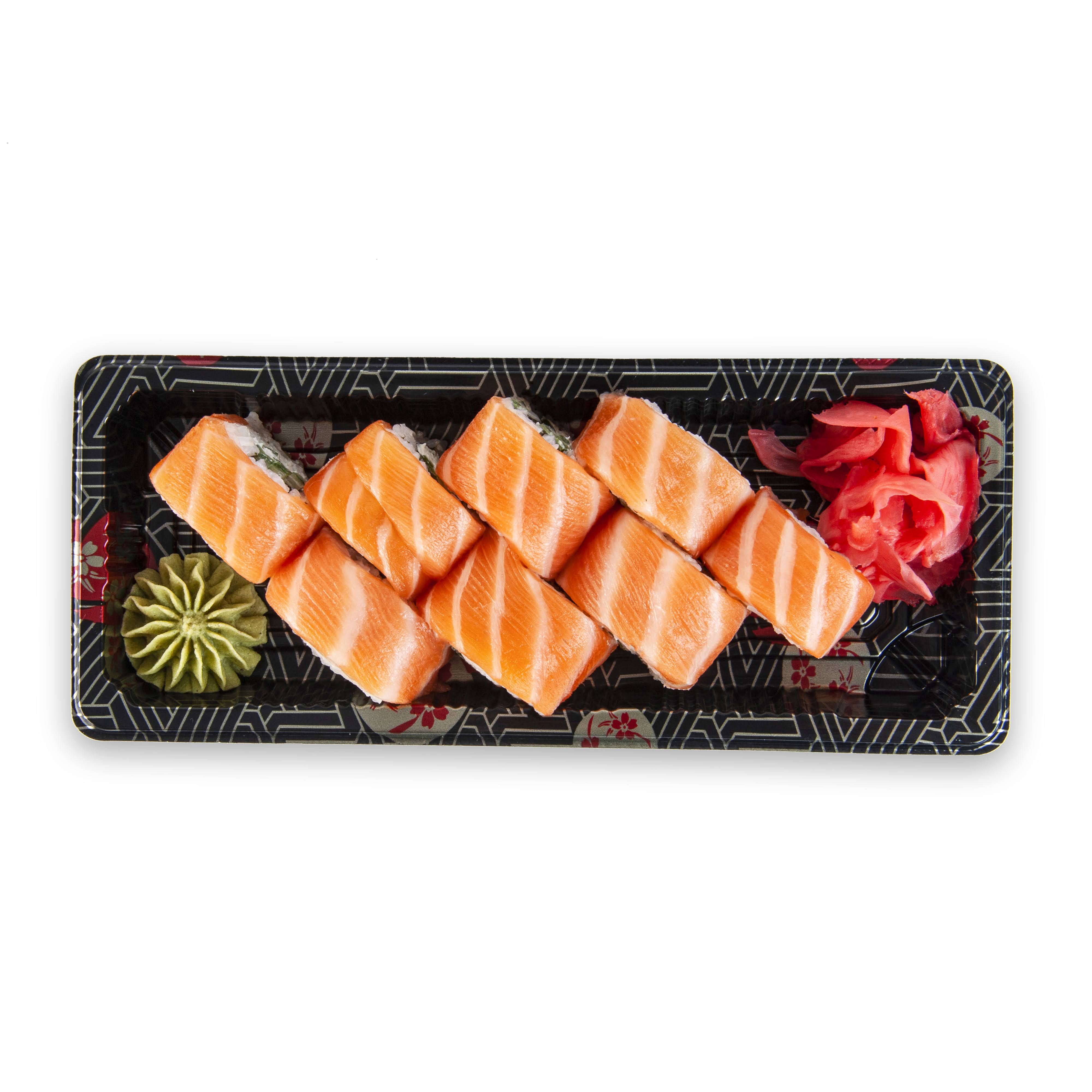 Orez pentru sushi 110 g ( apa 63 ml, orez 55 g, otet de orez 6 ml, zahar 3 g, sare 1 g, alge combu uscate), file de SOMON 80g (PESTE), crema de BRANZA 45g (Branza proaspata de vaca ( LAPTE de vaca pasteurizat, cheag microbian, culturi lactice), amidon din tapioca, sare), castraveti fabio 30 g, ghimbir murat roz 27 g (ghimbir, apa, sare, sorbat de potasiu, acid citric, acid acetic, aspartam, sucraloza, acesulfam de potasiu, colorant E163), wasabi 20g (apa 11ml, wasabi pudra 9g ), sos de SOIA 13 ml ( apa, SOIA, GRAU, sare, alcool etilic), apa 13 ml, zahar 4g, foi nori 3 g (alge uscate).