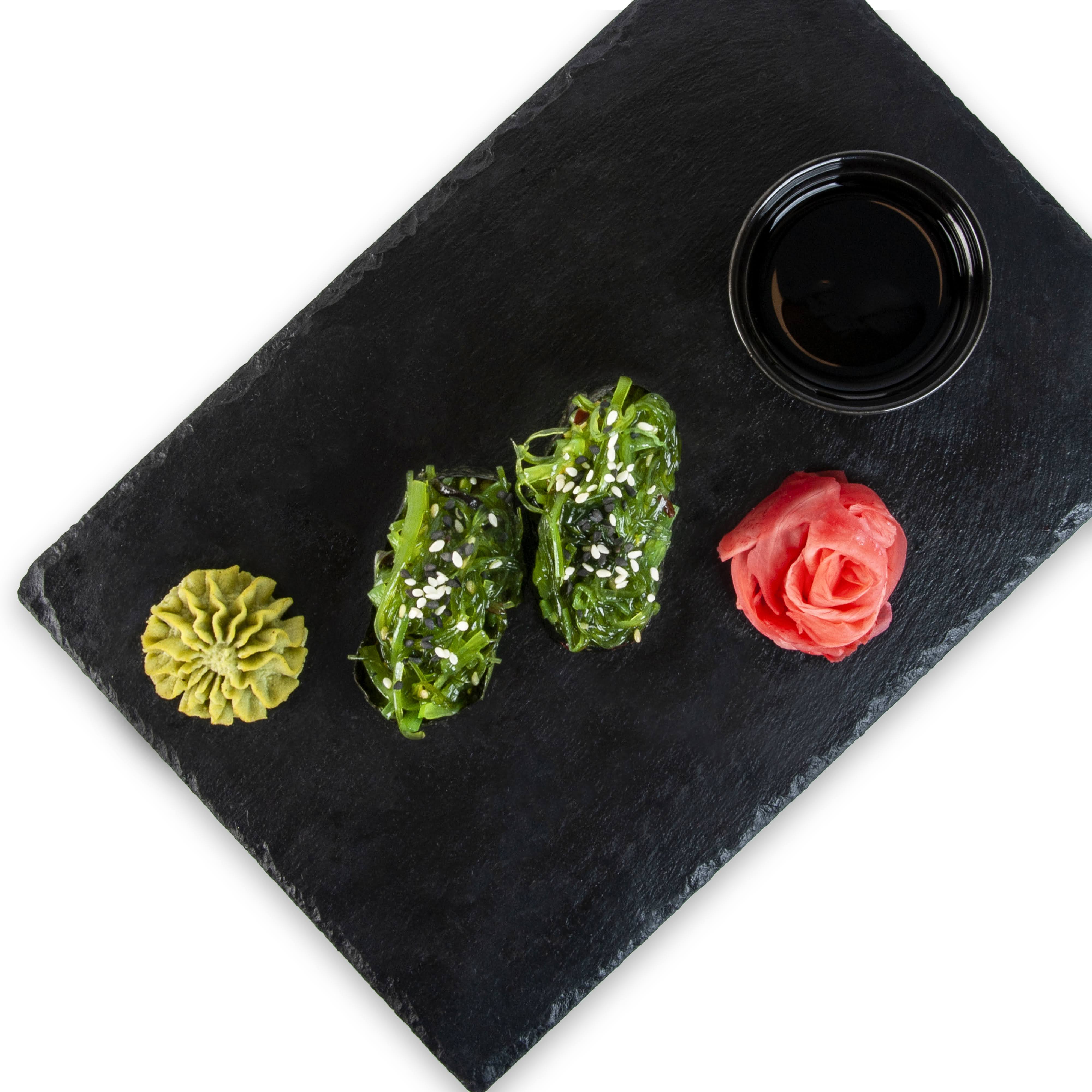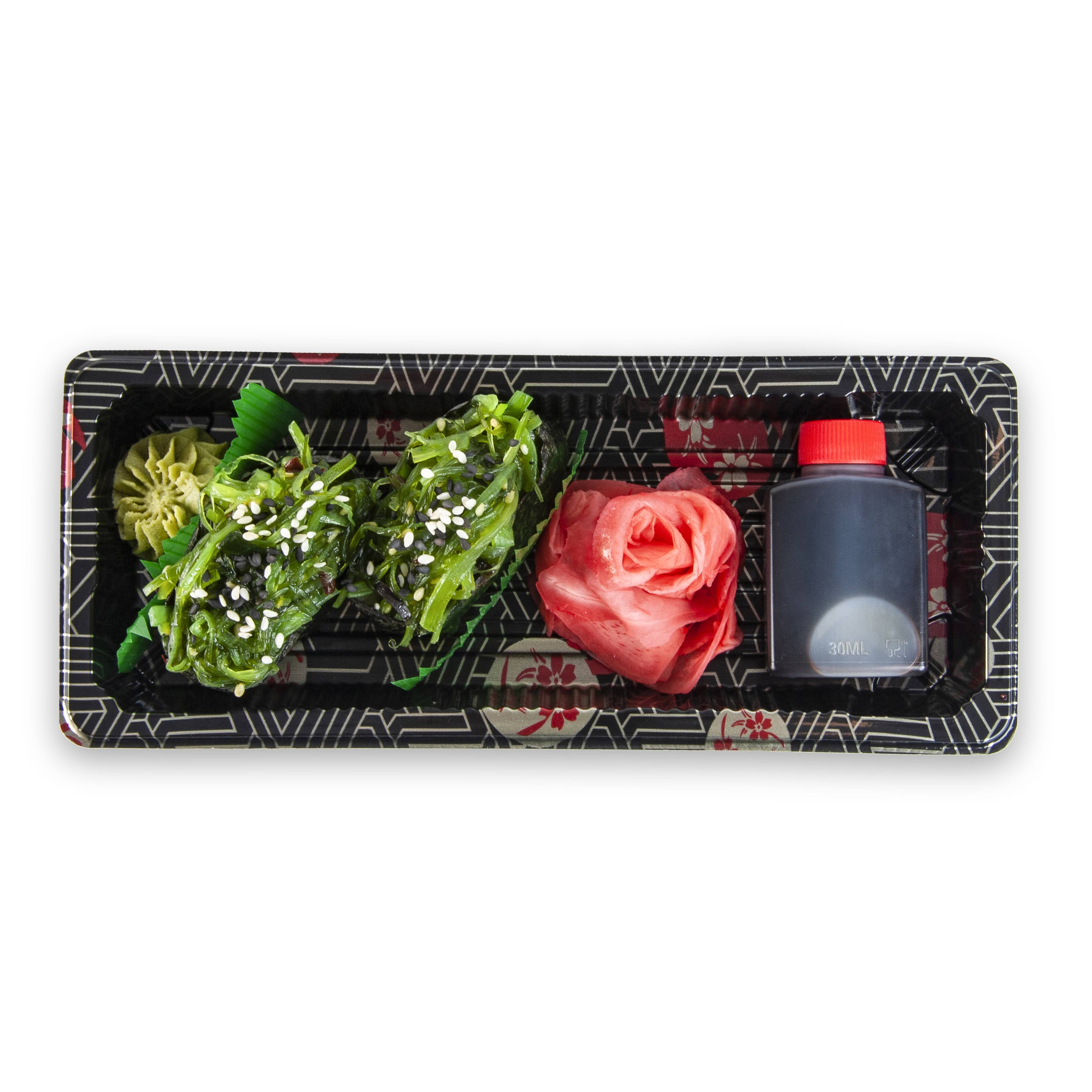 Orez pentru sushi 50 g ( apa 29 ml, orez 28 g, otet de orez 3 ml, zahar 1 g, sare 1 g, alge combu uscate), salata de alge marine Wakame 40g (alge de mare (70, 725%), seminte SUSAN, ciuperci negre (2, 2%), chili, ulei de SUSAN, zahar, sare, sirop porumb cu multa fructoza, otet, sos de SOIA (apa, boabe de SOIA, GRAU (GLUTEN), sare), agent de ingrosare (monoglutamat de sodiu, guma xantan), coloranti (tartrazina, albastru)), dressing cu SUSAN 10g (Ulei vegetal (rapita, SOIA), apa, sos de SOIA ( SOIA degresata, GRAU, sare, SOIA), zahar, otet (apa, suc de mere, alcool, porumb, sirop de porumb bogat în fructoză, drojdie de sake, zahar), susan 5%, extract de ciuperci Shiitake(extract de ciuperci Shiitake, sirop de porumb bogat în fructoză, dextrina, sare), sare, extract de drojdie pudra(extract de drojdie, sare, drojdie uscata), galbenus de OU (galbenus de OU, sare), extract de condimente(extract de susan, extract de mustar), condimente), seminte de SUSAN 2g, foi nori 1.5g ( alge uscate).