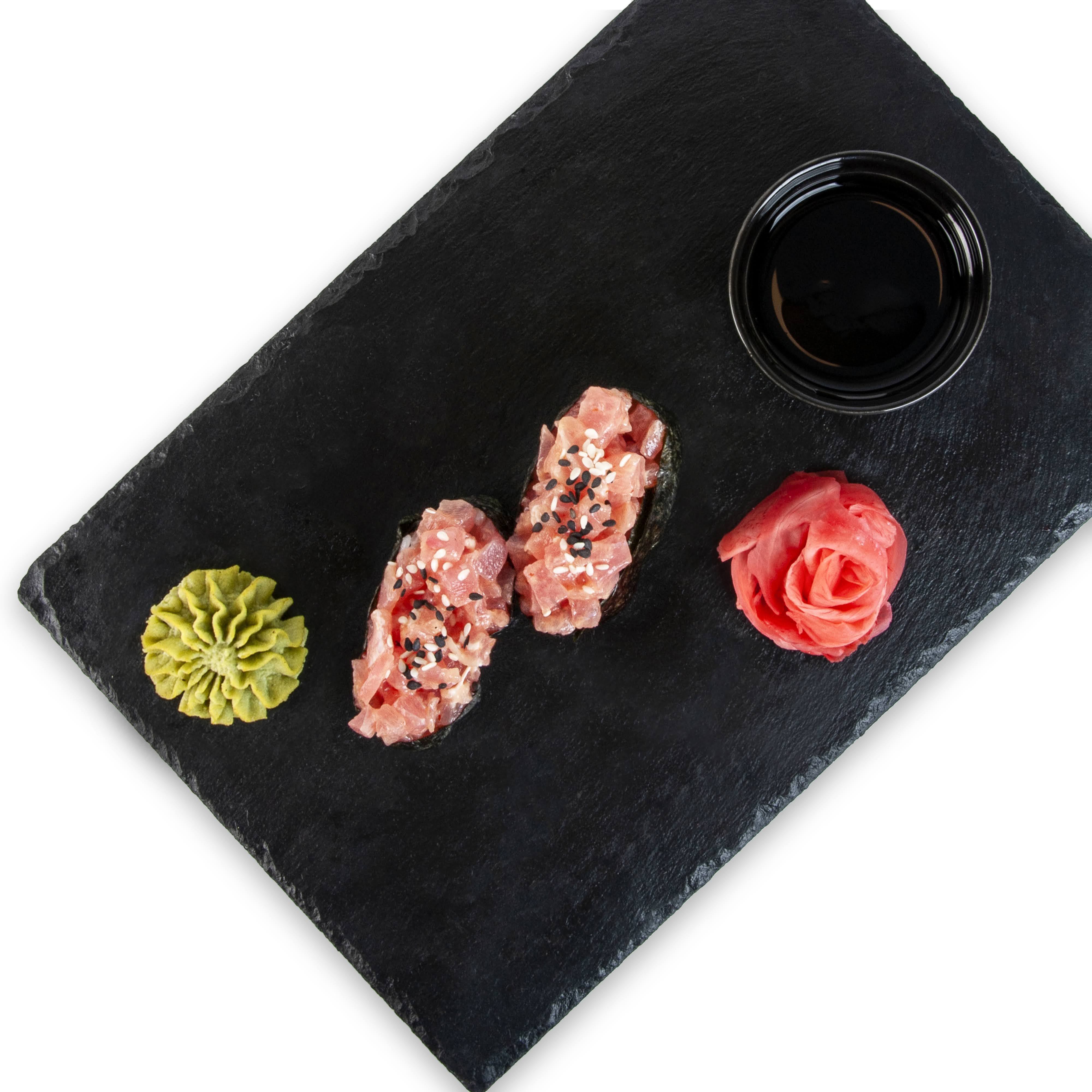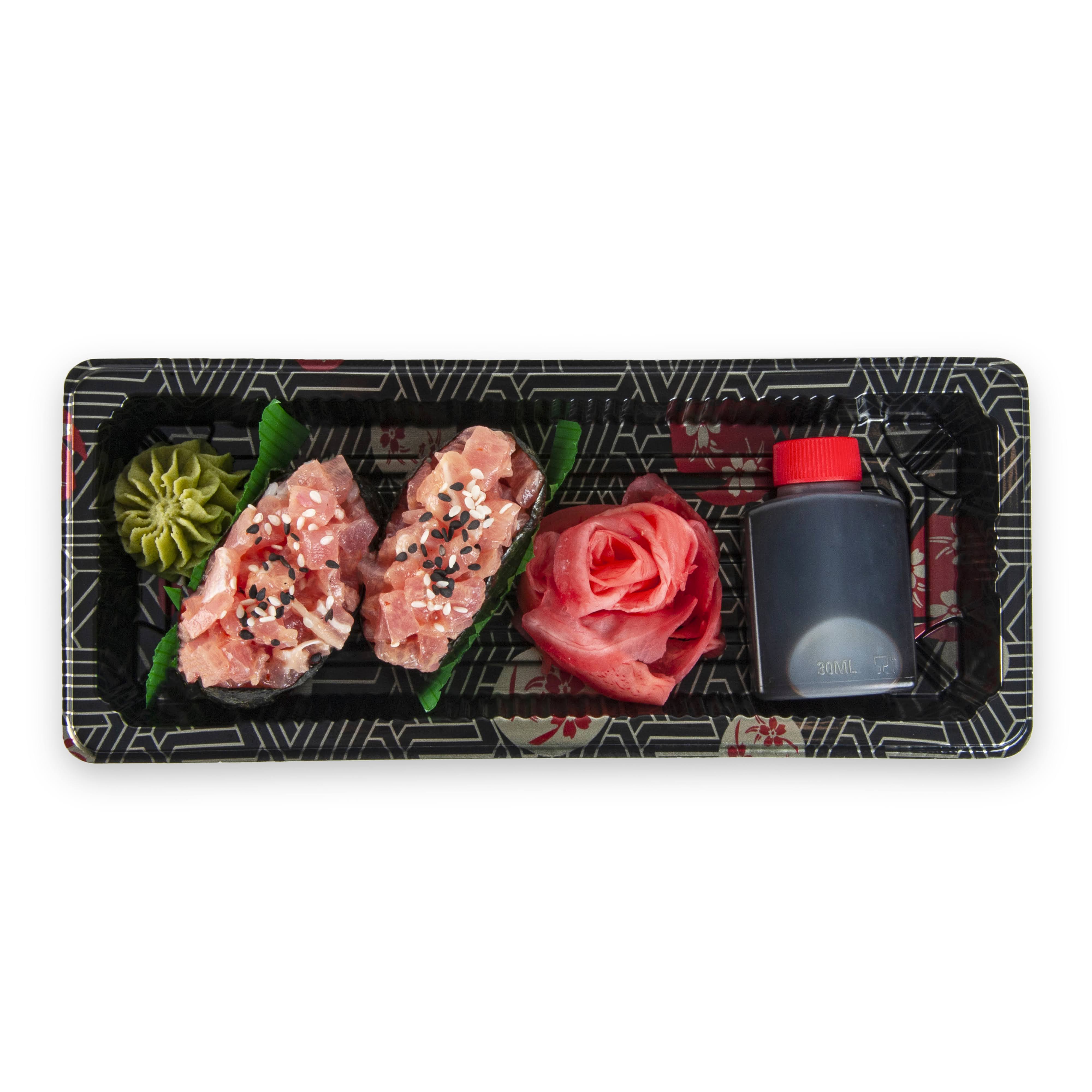 Orez pentru sushi 50 g ( apa 29 ml, orez 25 g, otet de orez 3 ml, zahar 1 g, sare 1 g, alge combu uscate), file de TON 35g (PESTE), sos spicy 15 ml (maioneza 12g ( ulei rafinat de florea soarelui ,apa,zahar, otet, MUSTAR (apa,otet,boabe de MUSTAR, zahar, sare), amidon modificat, sare, acidifiant (acid lactic), stabilizator (guma de xantan),praf de OUA(0.3%), conservant (sorbat de potasiu), antioxidant, colorant (beta caroten), sos Sriracha 2g (ardei iute chili , zahar, apa, sare, usturoi, potentiator de aroma: monoglutamat de sodiu: stabilizator: guma de xantan: corectori de aciditate: acid acetic, acid citric: conservant: sorbat de potasiu ), ulei de SUSAN 1ml, sos de SOIA ( apa, BOABE DE SOIA, GRAU, sare), zahar, sare), foi nori 1.5g (alge uscate), seminte susan 1g.