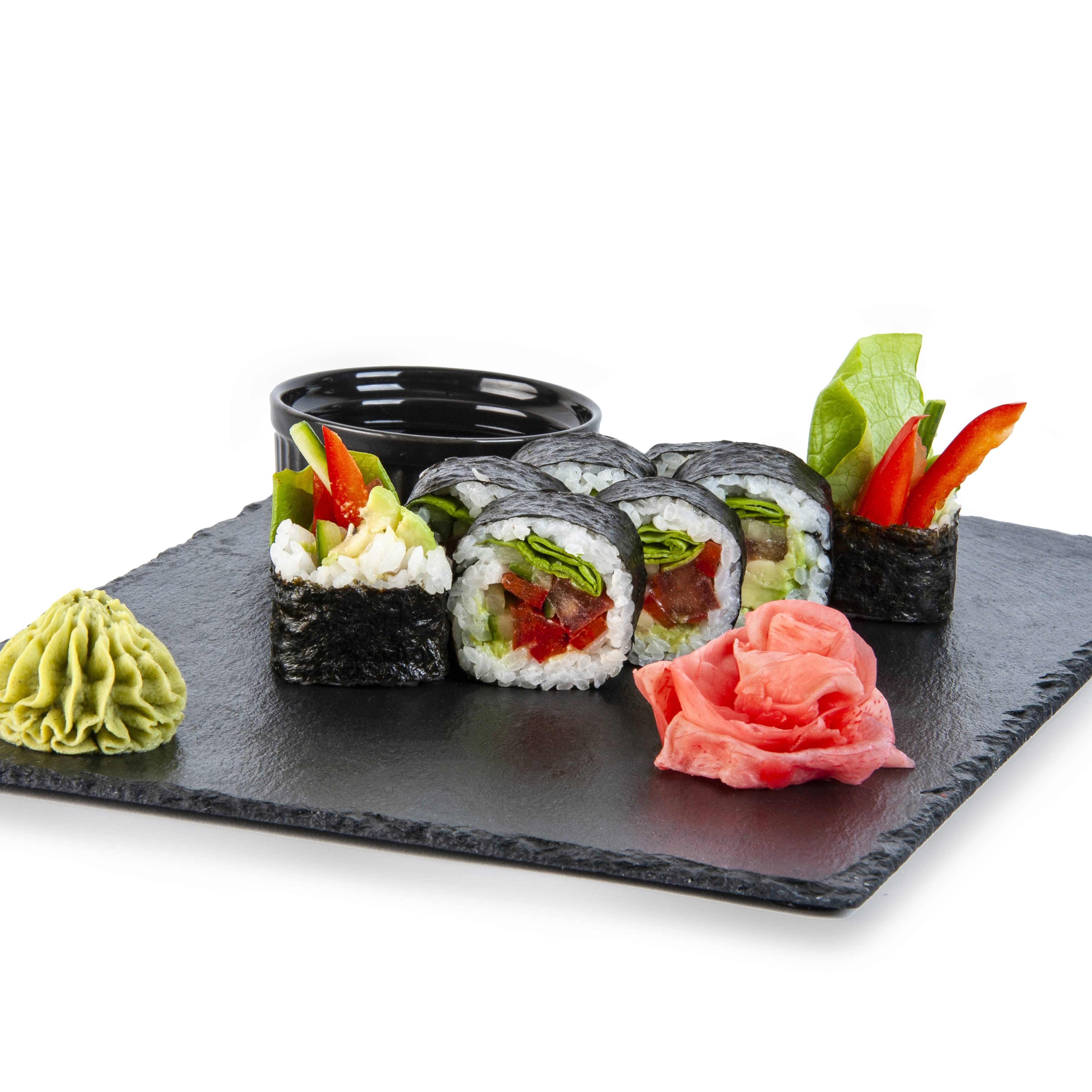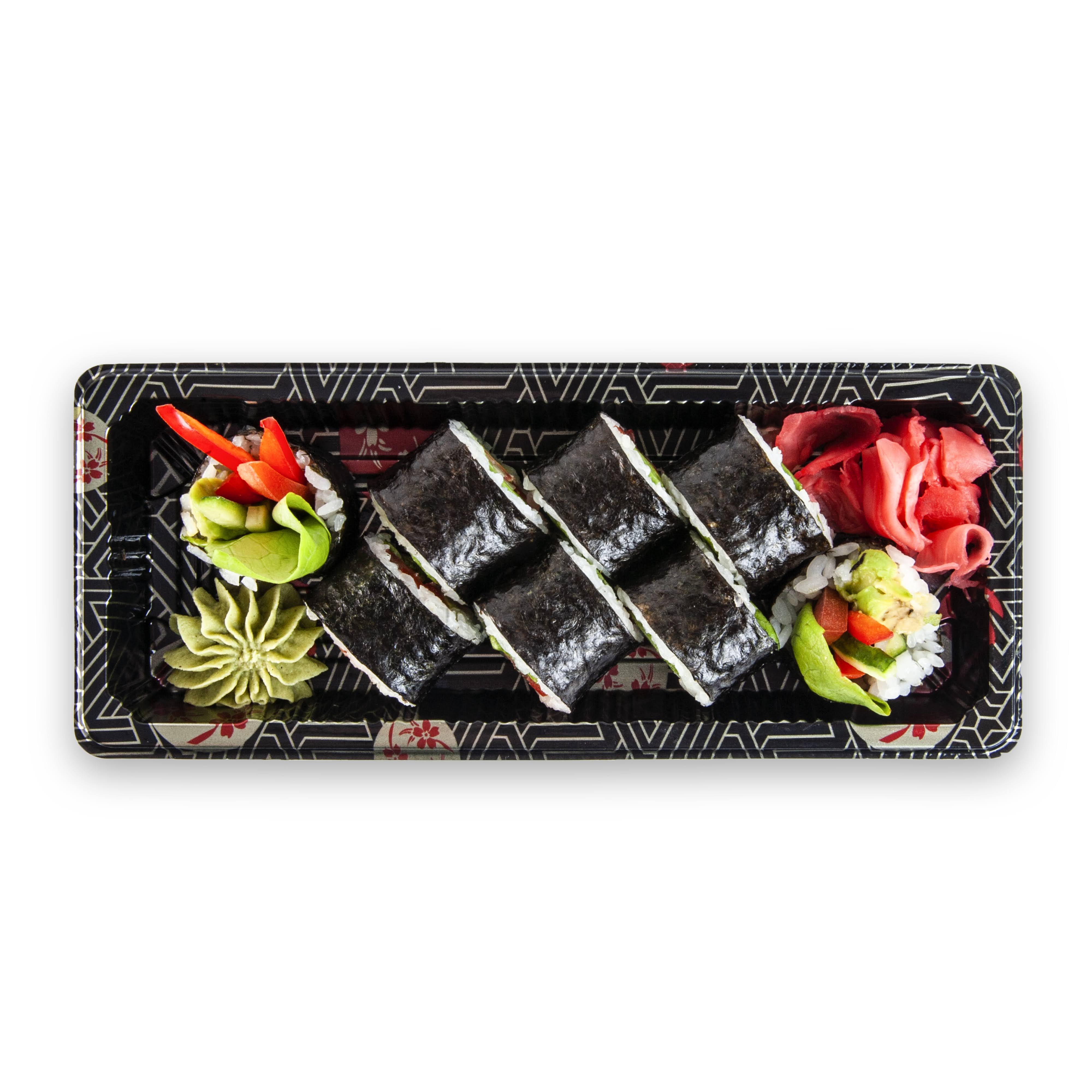 Orez pentru sushi 110 g ( apa 63 ml, orez 55 g, otet de orez 6 ml, zahar 3 g, sare 1 g, alge combu uscate), ghimbir murat roz 27 g (ghimbir, apa, sare, sorbat de potasiu, acid citric, acid acetic, aspartam, sucraloza, acesulfam de potasiu, colorant E163), castraveti fabio 20 g, wasabi 20g (apa 11ml, wasabi pudra 9g ), salata verde 15g, rosii 15g, avocado 15g, ardei gras 15g, sos de SOIA 13 ml ( apa, SOIA, GRAU, sare, alcool etilic), apa 13 ml, zahar 4g, foi nori 3 g (alge uscate).