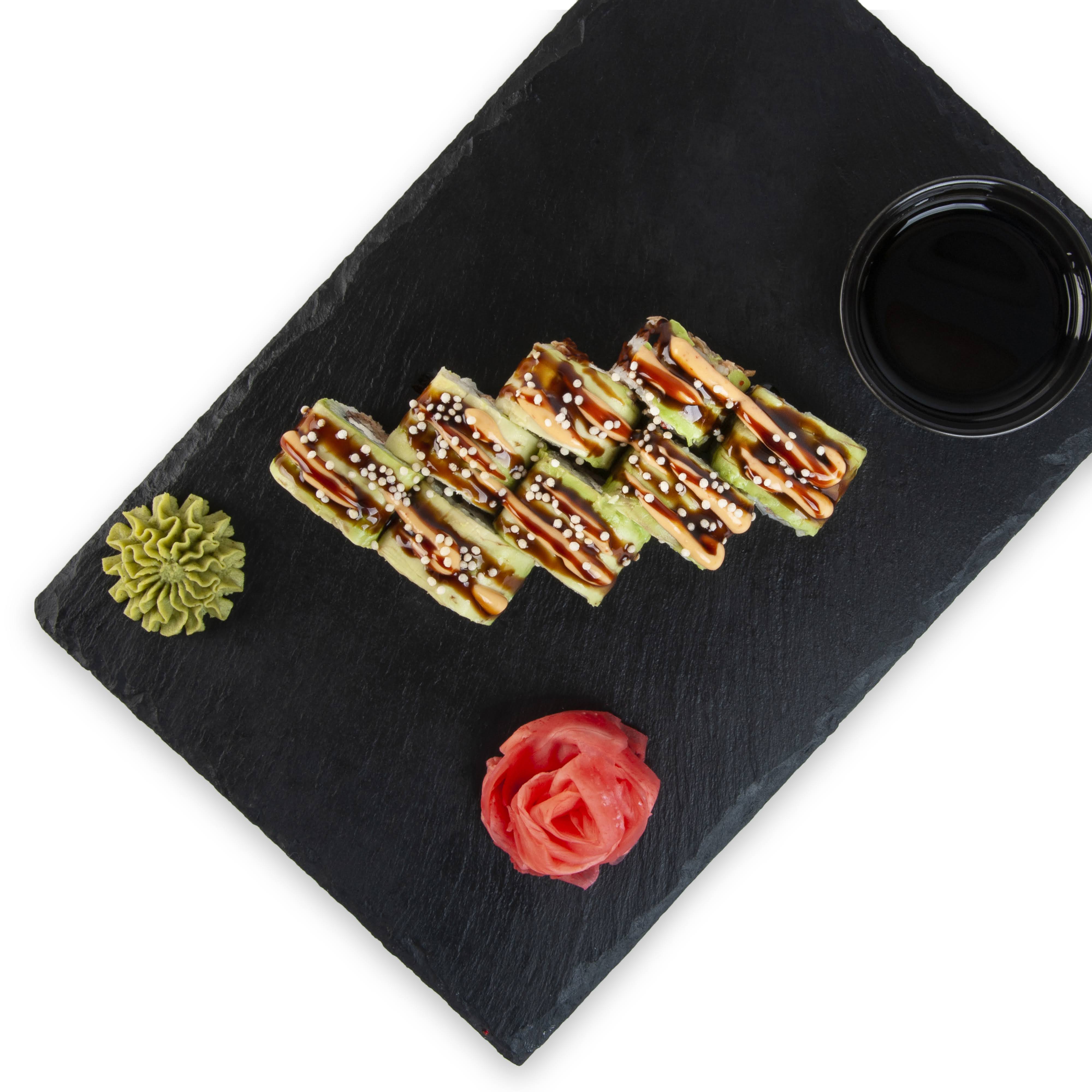 Orez pentru sushi 110 g ( apa 63 ml, orez 55 g, otet de orez 6 ml, zahar 3 g, sare 1 g, alge combu uscate), file de SOMON 50 g (PESTE), avocado 30 g, ghimbir murat roz 27 g (ghimbir, apa, sare, sorbat de potasiu, acid citric, acid acetic, aspartam, sucraloza, acesulfam de potasiu, colorant E163), crema de BRANZA 20 g (Branza proaspata de vaca ( LAPTE de vaca pasteurizat, cheag microbian, culturi lactice), amidon din tapioca, sare), anghila Unagi 20 g (anghila 80%, sos de SOIA 20% (apa, GRAU, boabe de SOIA, sare), apa, sirop glucoza, zahar, mirin, agent de ingrosare E415, colorant E150a, potentiator de aroma E627 ), wasabi 20g (apa 11ml, wasabi pudra 9g ), sos de SOIA 13 ml ( apa, SOIA, GRAU, sare, alcool etilic), apa 13ml, ICRE red masago 5g ( ICRE de capelin (PESTE) 45%, ICRE de hering (PESTE) 43%, zahar, sare, sos de SOIA (apa, SOIA, sare, otet), mirin, otet, colorant E110, E129) , sos Unagi 5g (zahar, sos de SOIA 33%( apa, sare, SOIA, GRAU, alcool) apa, dextroza monohidrat, amidon modificat, sake vin de orez (apa, orez, orez koji - contine SULFITI), colorant E150a, agent de ingrosare E415), sos Spicy 5g (maioneza 4g (ulei rafinat de floarea soarelui, apa, zahar,galbenus de OU, sare, emulgator (amidon), regulator de aciditate (acid acetic, acid citric), stabilizator (guma xantan), conservant (sorbat de potasiu), aroma mustar (E385), colorant natural (beta-caroten)), sos Sriracha 1g( Ardei iute chili, zahar, apa, sare, usturoi, potentiator de aroma: monoglutamat de sodiu: stabilizator: guma de xantan: corectori de aciditate: acid acetic, acid citric: conservant: sorbat de potasiu), ulei de susan, sos soia (apa, GRAU, boabe de SOIA, sare), zahar, apa), zahar 4g, nori 3g (alge uscate), tapioca 3g.