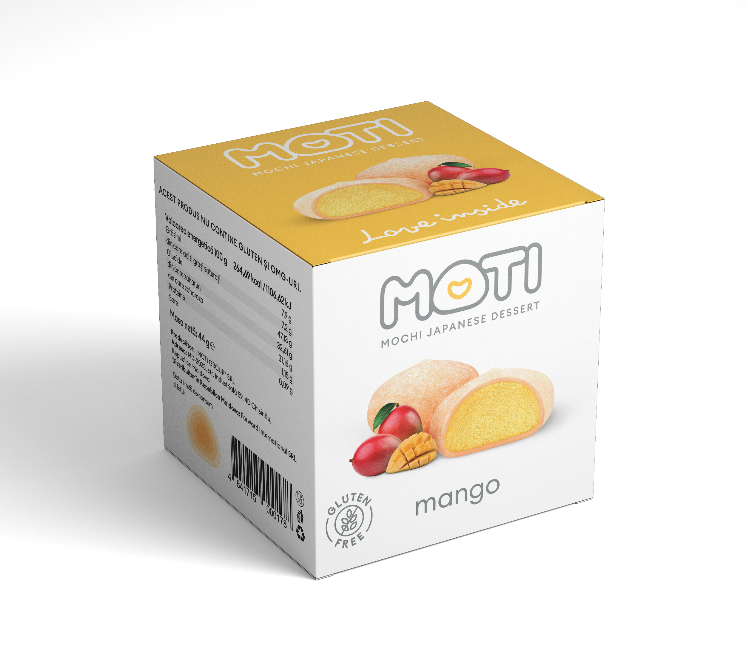 Ingrediente: Aluat: făină de orez, zahăr, apă, colorant alimentar (E102), (E110). Umplutură cu gust de mango (50%): frișcă vegetală (apă, grăsime vegetală complet hidrogenată 25% (palmier), zahăr (21%), emulgatori (E435, E491, lecitină de soia, E481, E471), stabilizatori (E464, E466, E331iii, E339ii, E412, E407), arome și coloranți (E160a), zahăr, pastă de mango (7%), dextroză, sirop de glucoză, emulgatori (E471 mono și digliceride ale acizilor grași, E477 esteri propan-1,2-diol ai acizilor grași), agenți de îngroșare (gumă de fasole E410, gumă de guar E412, carboximetilceluloză E466, pectină), arome naturale, corectori de aciditate (acid citric), coloranți alimentari: (beta-caroten).
